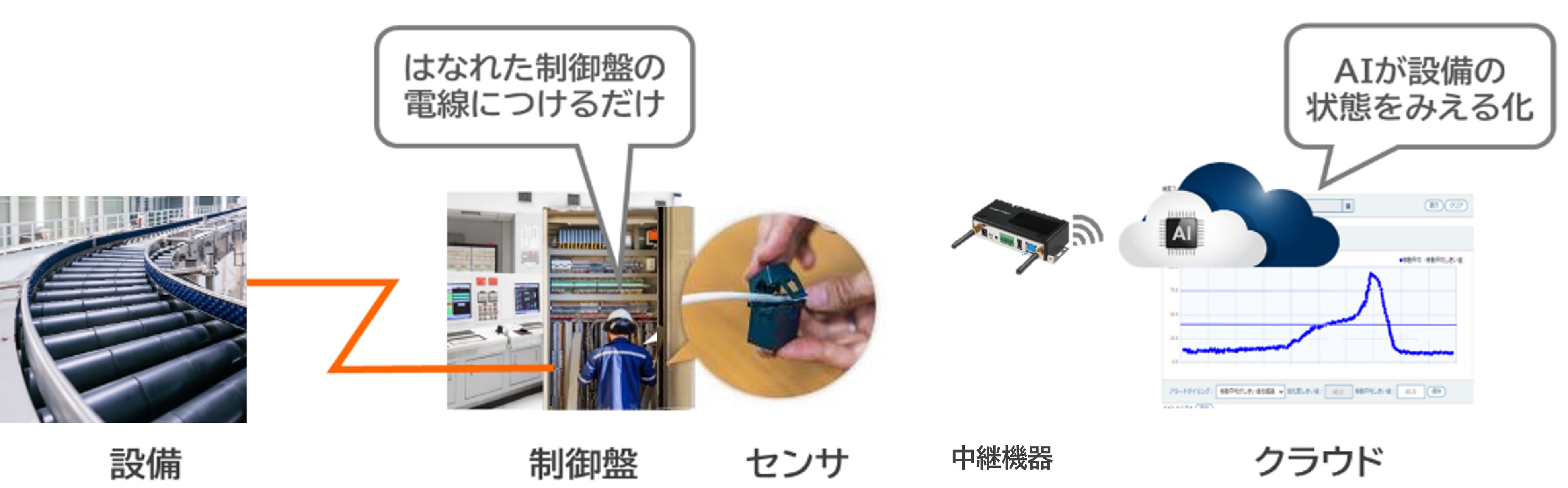 電流の一領域である「高調波」のセンシングと「少ないデータで分析できるAI」で、設備の状態を診断するクラウドサービス。設備診断に広く使われる振動センサと比べ、設備に直接センサを取り付けする必要が無く、制御盤への設置で利用可能です。故障予知製品の検討時にありがちな、