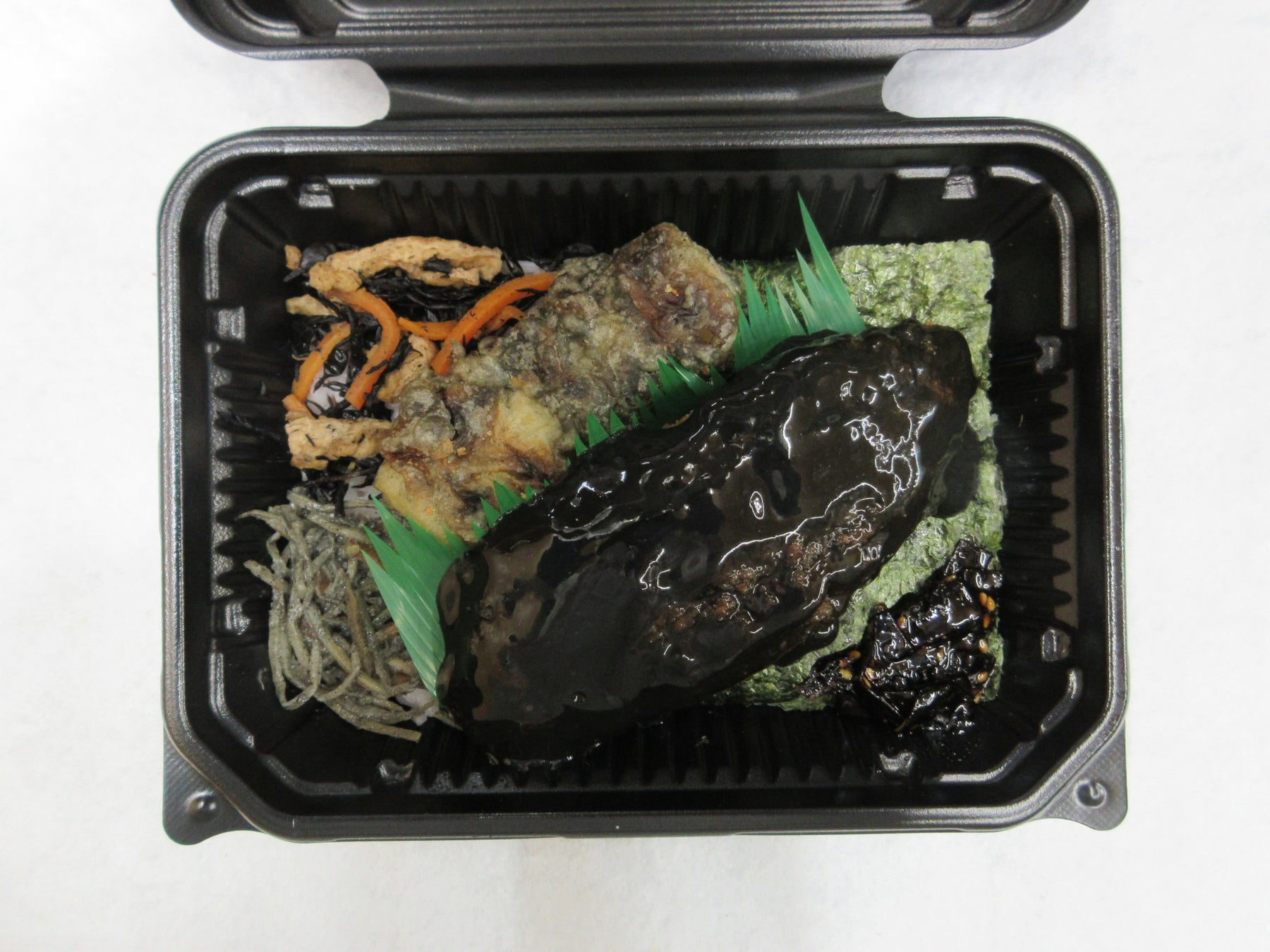 特長:白身魚フライがイカ墨入りソースで真っ黒に!