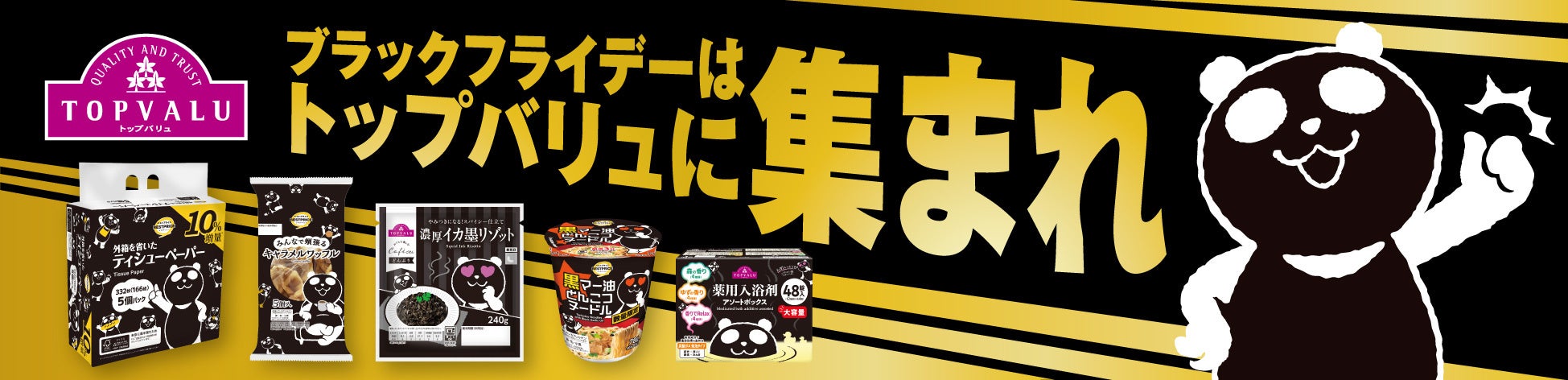 ブラックフライデーの名にちなみ、「黒」をテーマにした限定商品や特別企画を展開します。黒仕立ての食品や黒パッケージの限定品、増量商品など、見ても選んでも食べても使っても楽しい“黒のサプライズ”が満載です。お買い得価格とおいしさや使いやすさを両立するトップバリュならではの遊び心で、家計を応援しながら“お買物のワクワク”をお届けします。