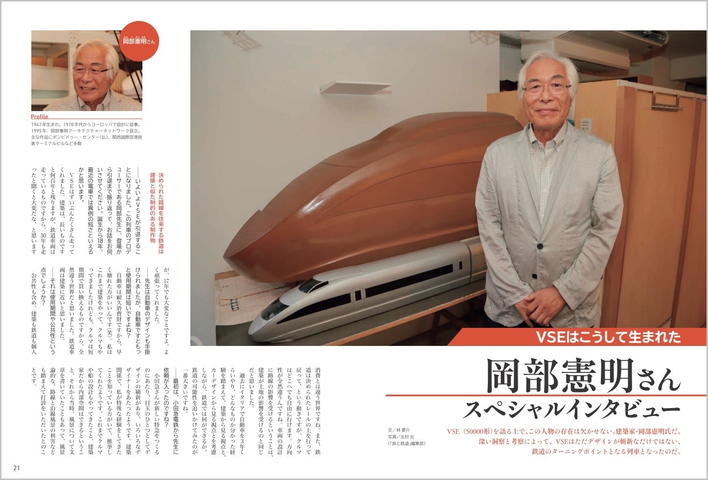 岡部憲明さんへのロングインタビューを14ページにわたって掲載。VSE開発のコンセプトだけでなく、建築家から見た鉄道車両の違和感とそれを改める設計、MSE、GSEへと続く小田急ロマンスカーの持続性など、大変興味深いお話を伺いました。