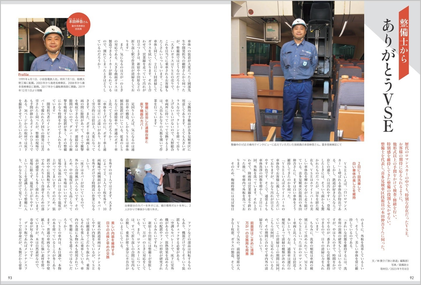 本誌は、小田急電鉄の協力を得て、喜多見検車区でVSEを取材。10両編成の車内を1両ずつ撮影したほか、通常はカバーで隠れている床下機器の写真を全車両、両側面で撮影し、掲載しています。さらに岡部憲明さんにインタビューをし、興味深いお話をたくさん伺いました。