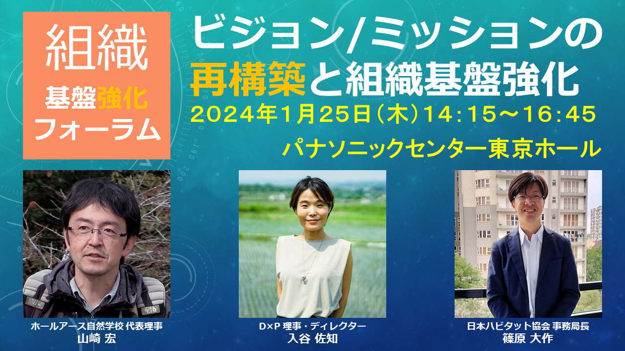 パナソニック ホールディングス株式会社(以下、パナソニック)は認定特定非営利活動法人 日本NPOセンターと共催で、2024年1月25日(木)に「ビジョン/ミッションの再構築と組織基盤強化」をテーマに組織基盤強化フォーラムを開催します。