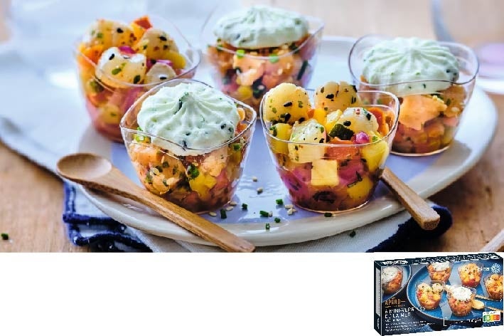 2種類の小さなカップ入りのアペリティフ(サーモンのタルタル、サンジャックのマリネ)は、それぞれにハーブやビネガー、野菜、フルーツを加え香り豊かに彩りよく仕上げました。解凍するだけでいただけるワインとの相性も抜群のアペリティフです。