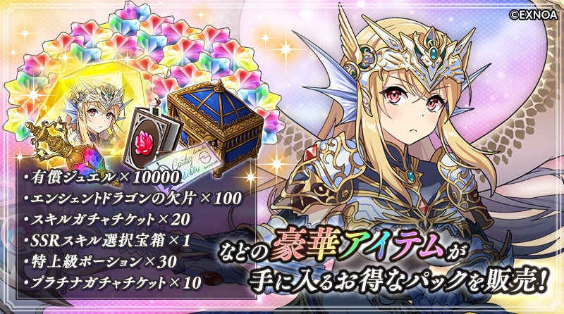 コラボ誓女「エンシェントドラゴン」が確定で入手できる「ドラゴンプロヴィデンスコラボ記念 エンシェントドラゴン確定パック」が登場!このパック商品では「エンシェントドラゴン」と交換できる「エンシェントドラゴンの欠片」の他、有償ジュエルも獲得することができます。