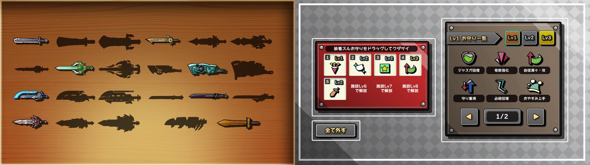 武器・防具・お守り(アクセサリー)にはそれぞれ特殊効果があり、組み合わせによってさまざまな戦略を取ることができます。