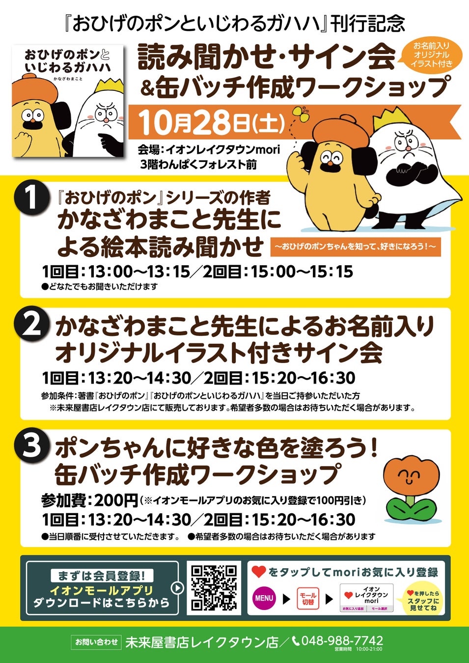 著者のかなざわまこと先生による読み聞かせに加えて、著書『おひげのポン』もしくは『おひげのポンといじわるガハハ』をご持参いただいた方には、ポンちゃんのかわいいイラスト付きサインをお名前入りで進呈いたします。