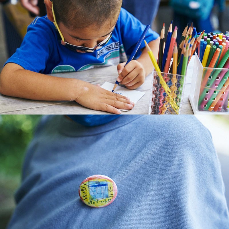 自分だけのオリジナル缶バッジが作れるワークショップ。絵を描いて専用の機械で挟み、10分程度で完成します。