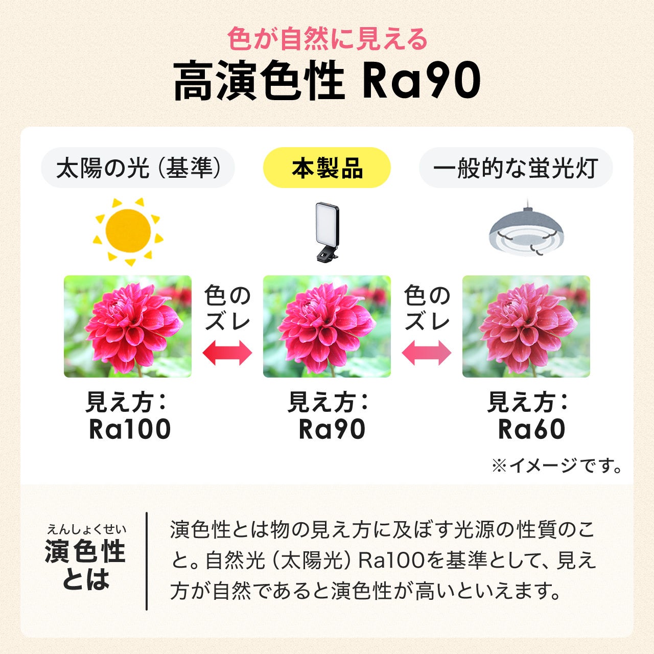 YouTube動画撮影やSNS用のコンテンツ制作、Zoomなどのオンライン会議、テレワークなど幅広いシーンで使用可能です。Ra90の高演色性LEDを採用しており、自然な色味で被写体を美しく照らします。