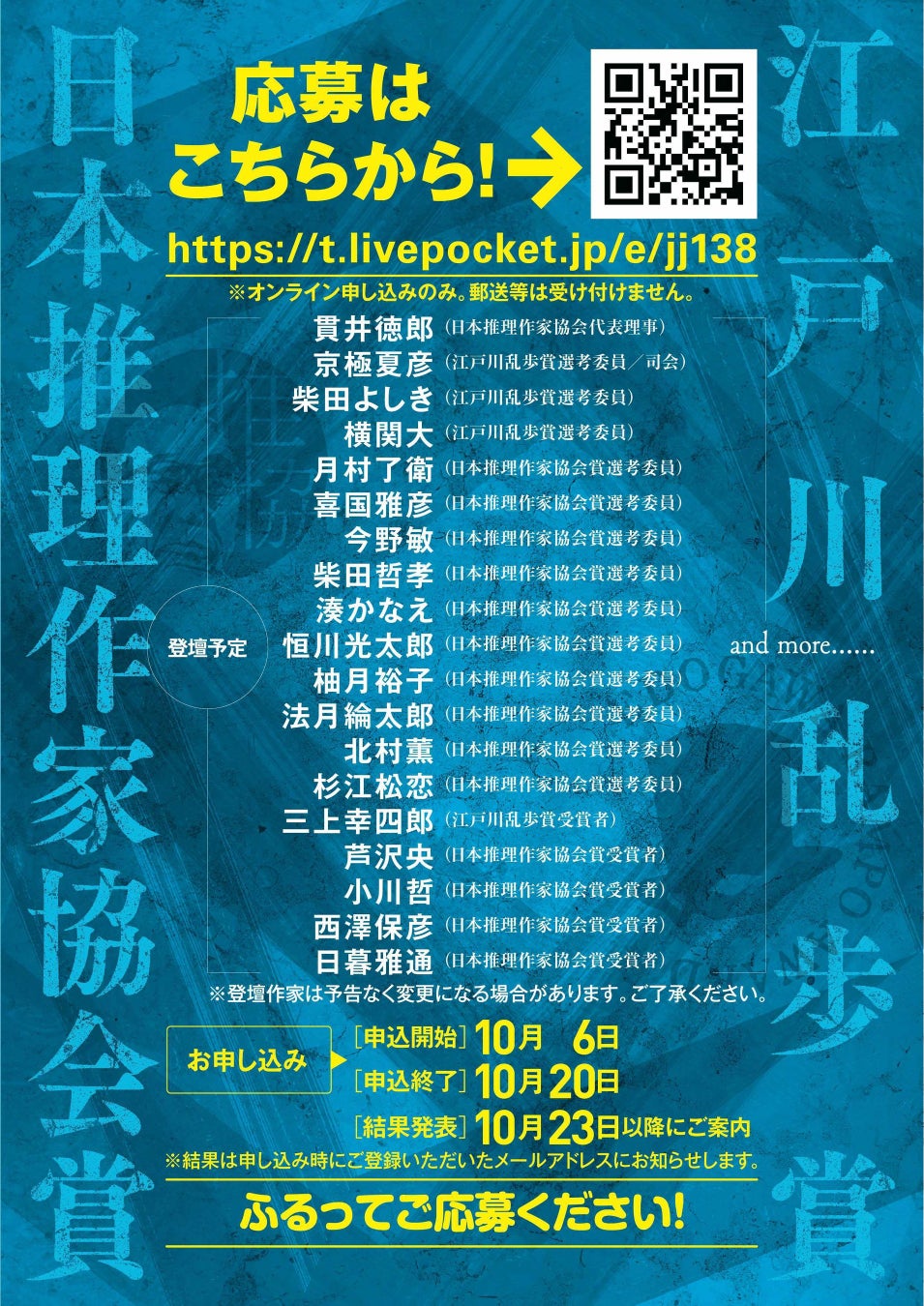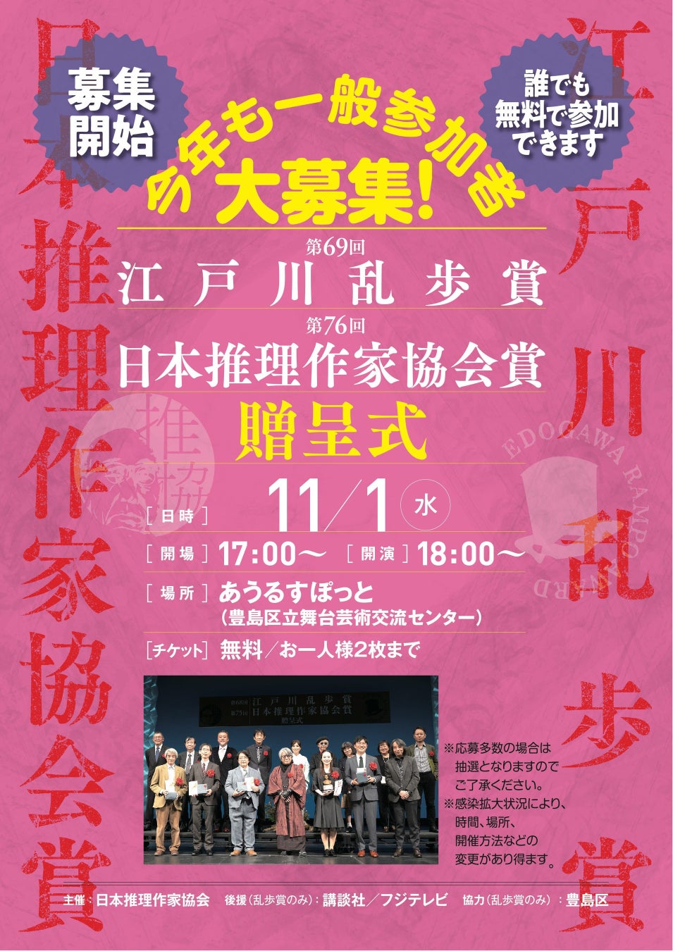 今年もやります!ミステリ作家大集合!!第69回江戸川乱歩賞/第76回日本推理作家協会賞贈呈式 一般参加者募集開始!