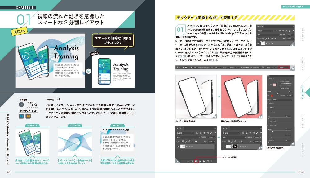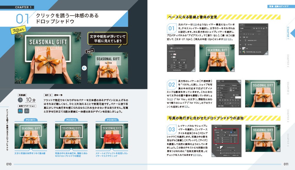 本書は、10〜15分程度のひと手間をかけて、パッとしないバナーをブラッシュアップするデザインテクニックを紹介しています。バナーの狭いスペースのなかで有効なデザインを、Before→Afterの流れで解説。デザインのアイデアだけでなく、完成に至る工程もステップ・バイ・ステップ形式で指南しているので、実際にどう手を動かせばよいかがわかります。バナーには“多様なサイズに展開される”という特徴もあるので、縦長と横長のサイズバリエーションも掲載。バナーデータはPSD形式またはAI形式でダウンロードできます。
