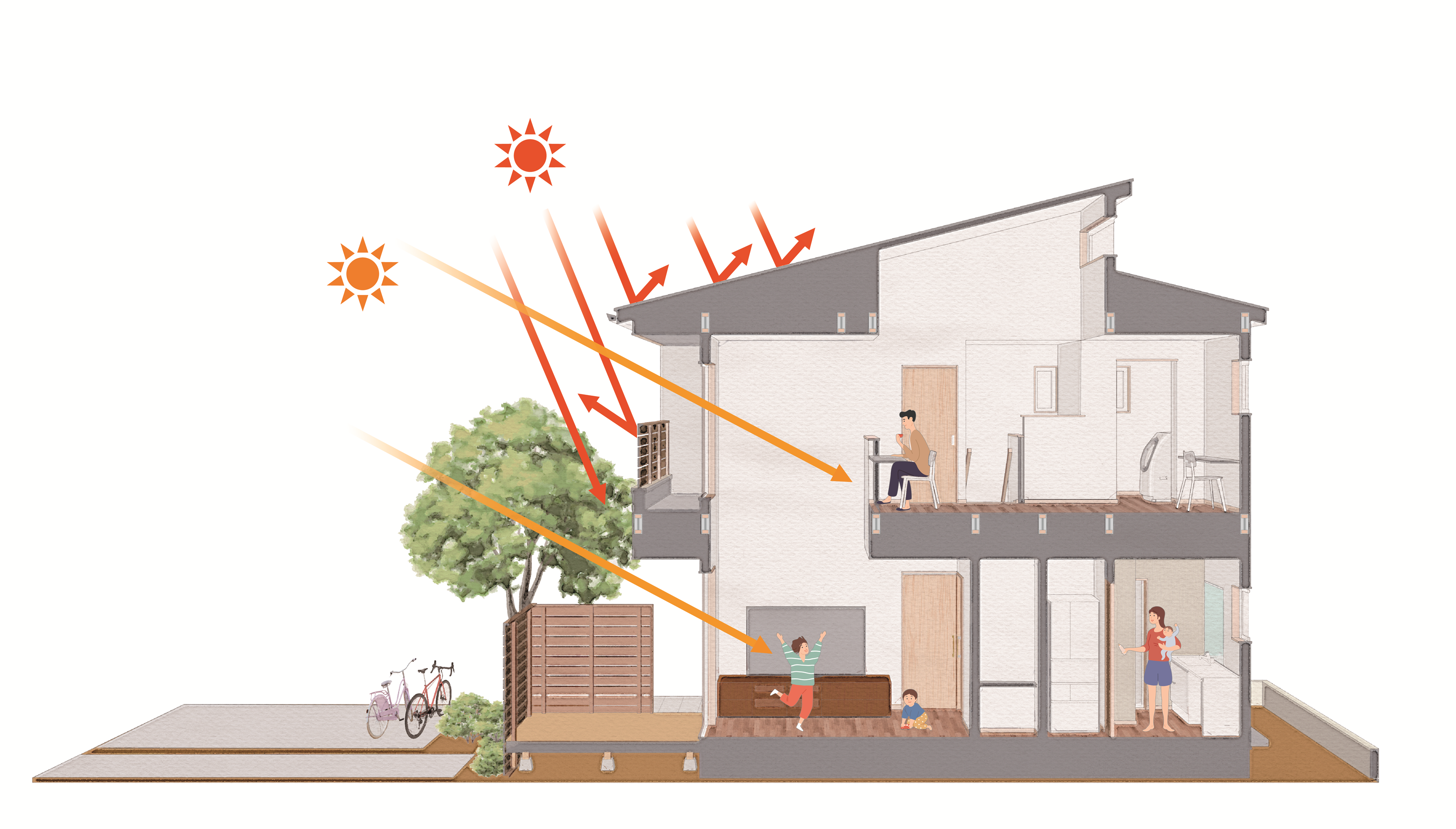 検討中のプランで十分な日あたりが確保できるかをシミュレーションで見える化します。太陽の軌道が高い夏至の日射状況をシミュレーションすることで1番日差しの入りにくい状況を確認できるほか、当社からシミュレーションをもとにした窓の位置やサイズ変更のご提案なども行います。