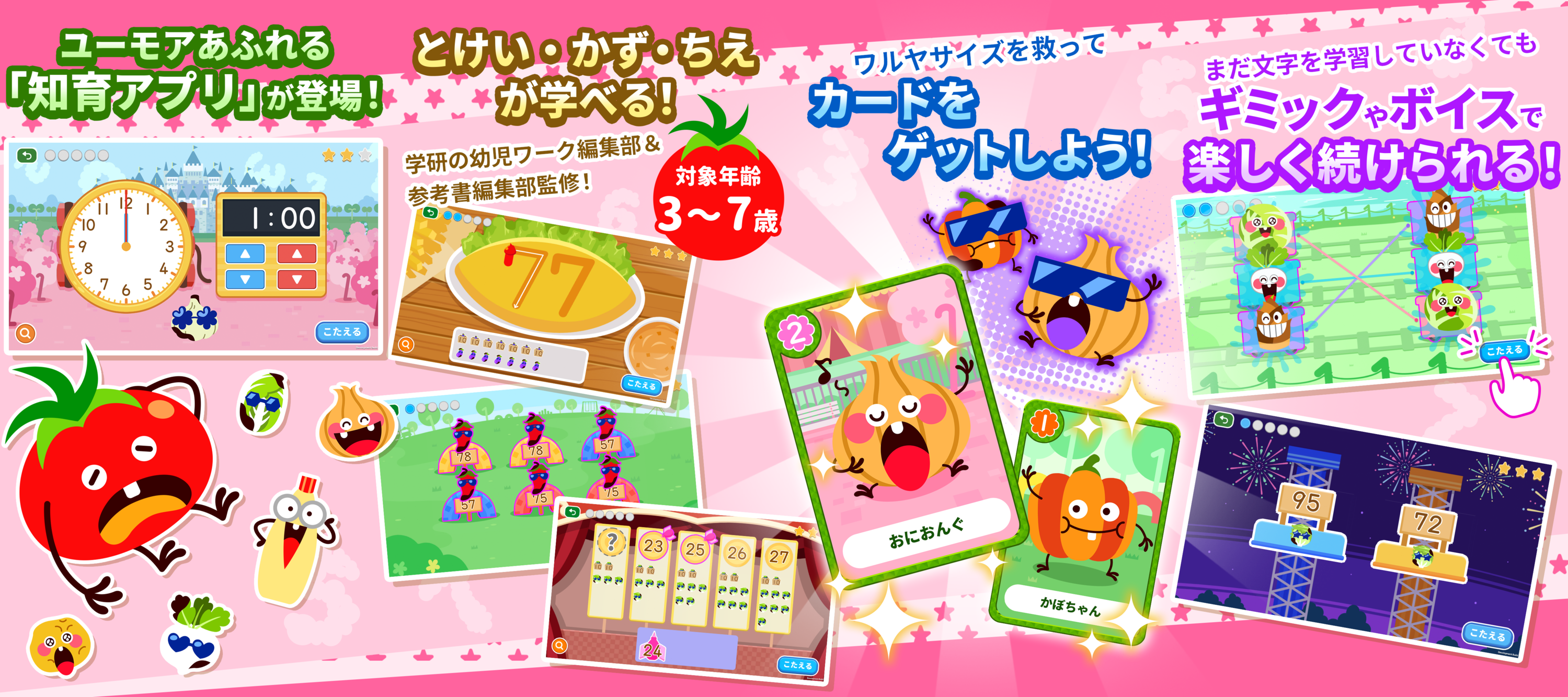 ユーモアあふれるキャラクターと演出でさんすうを楽しみながらクリアを目指し、キャラクターカードをゲットしよう!