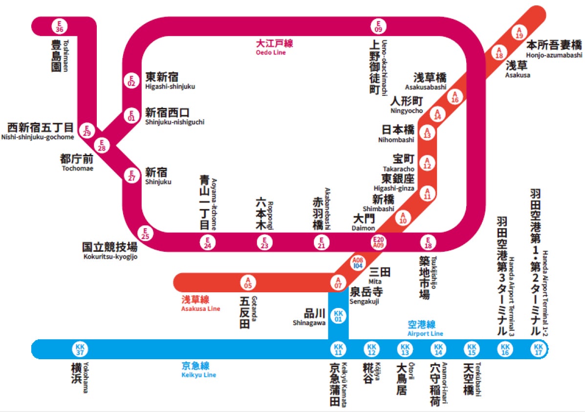 都営浅草線:五反田駅、泉岳寺駅、三田駅、大門駅、新橋駅、東銀座駅、宝町駅、日本橋駅、人形町駅、浅草橋駅、浅草駅、本所吾妻橋駅