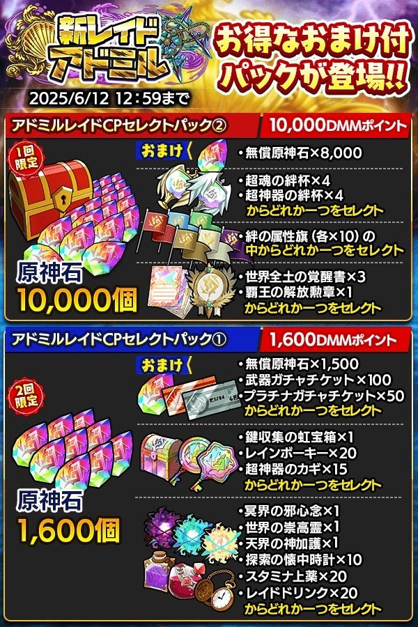 原神石に加えて、ガチャチケットや限界突破アイテムなど、お好きなアイテムを選択できる「アドミルレイドキャンペーンセレクトパック」が2種登場!