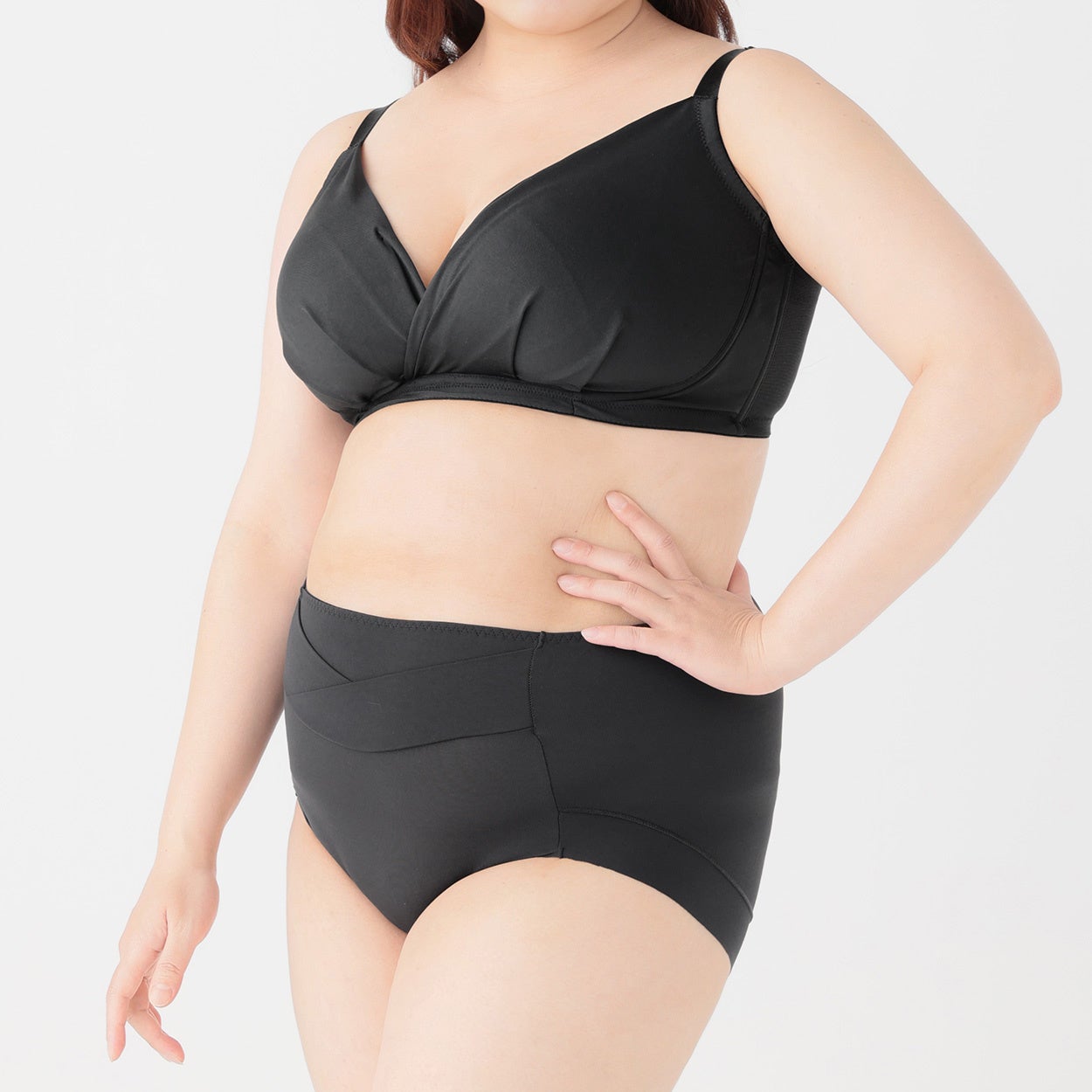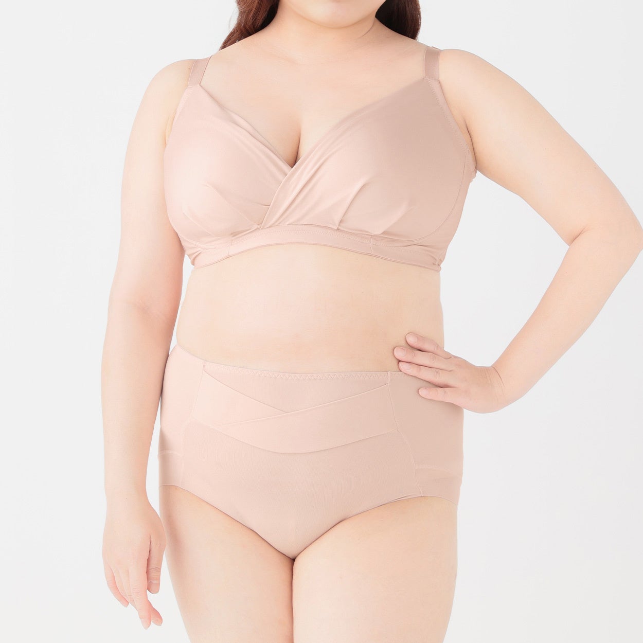 従業員の「ぽっちゃりサイズの商品をもっと増やして欲しい」という声を反映し、ぽっちゃりサイズのノンワイヤーブラをシリーズで初めて企画しました。2025年3月から販売している「よせ上げバストノンワイヤーブラ」をもとに、ぽっちゃりサイズ用に改良しています。