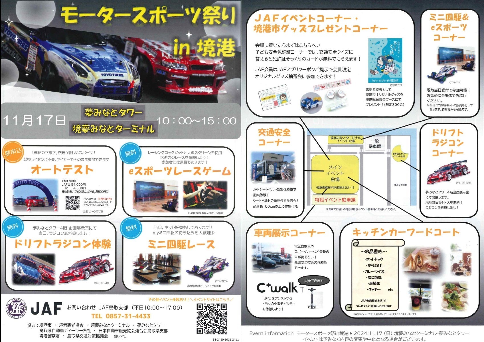 JAF(一般社団法人日本自動車連盟)鳥取支部(支部長 米原 良)は、11月17日(日)に境夢みなとターミナルおよび夢みなとタワー(境港市)でモータースポーツ祭を開催します。実車を使用した競技「オートテスト」のほか、ラジコンレース、ミニ四駆レースなど、さまざまなイベントを同時開催します。また、交通安全コーナーを設け、時速5kmでの衝突疑似体験やパトカー展示もおこないます。