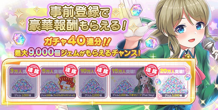 開催中の事前登録キャンペーンでは、事前登録者数が15万人を突破したことで「ジェム2,000個」と「SSR小春セリーナ[First Step]」が達成報酬に追加されました! 達成済みの「ジェム計4,000個」と「プレミアムガチャチケット10枚」と合わせてサービス開始後にプレゼントいたします。次の目標である20万人突破に向けて、ぜひ事前登録にご参加ください!