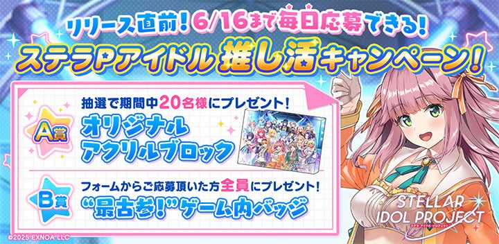 合同会社EXNOA (本社:東京都港区、CEO:村中 悠介、URL: https://games.dmm.com/) が運営するDMM GAMESにおいて、『STELLAR IDOL PROJECT』のリリース日が【2025年6月17日(火)】に決定したことをお知らせいたします。それを記念して6月9日(月)より事前登録ガチャのSSRアイドル排出率が2倍になるキャンペーンを開始いたしました。