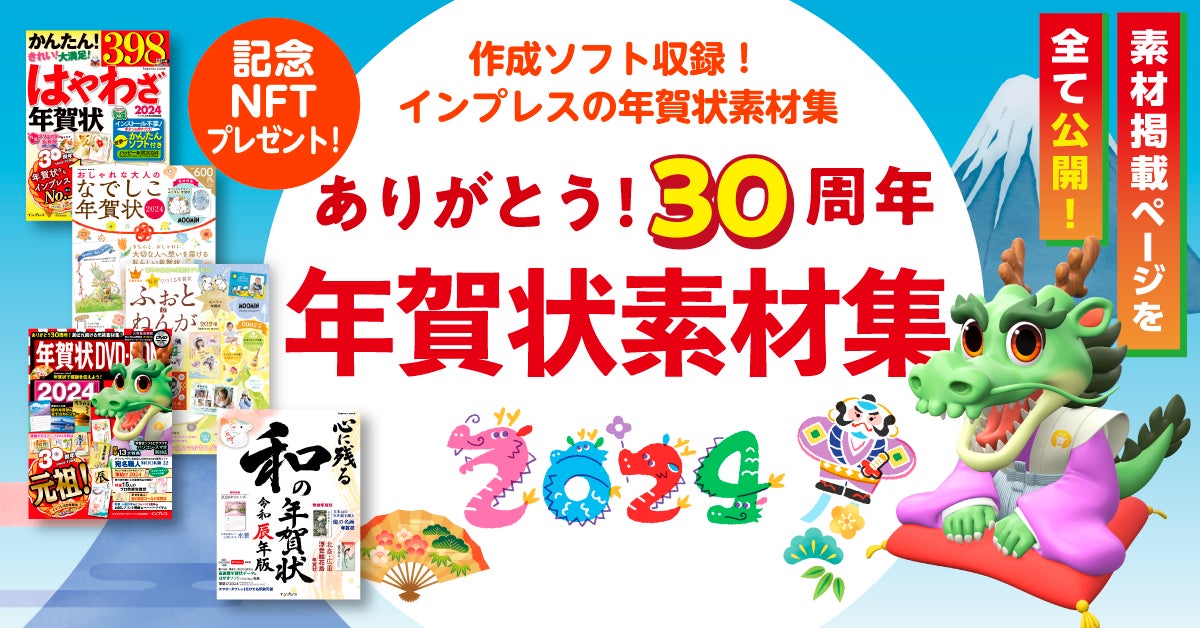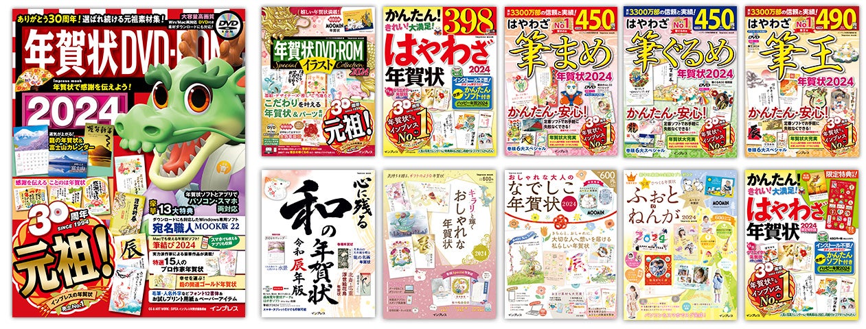 インプレス年賀状シリーズは、1994年に『年賀状CD-ROM for Windows』を、出版業界で初めてのROMメディア付き年賀状素材集として発刊して以来、年賀状素材集の「元祖」として毎年発刊し続け、2023年で30周年を迎えました。2024年辰年版には書店向け10タイトル、コンビニ向け1タイトルの11タイトルを発刊し、シリーズ合計の累計発行部数は3,000万部を超えます。