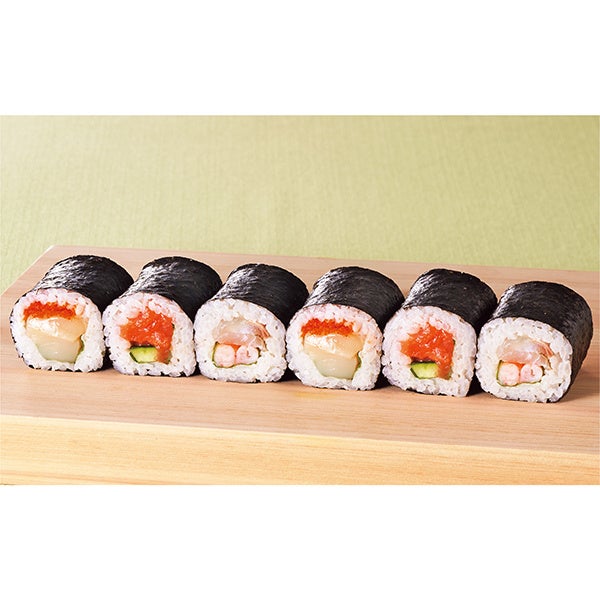 日本海の冷水で育った甘さ際立つとろっとした食感の“ふくい甘えび”を、ねぎと合わせてさっぱりと仕上げた太巻です
