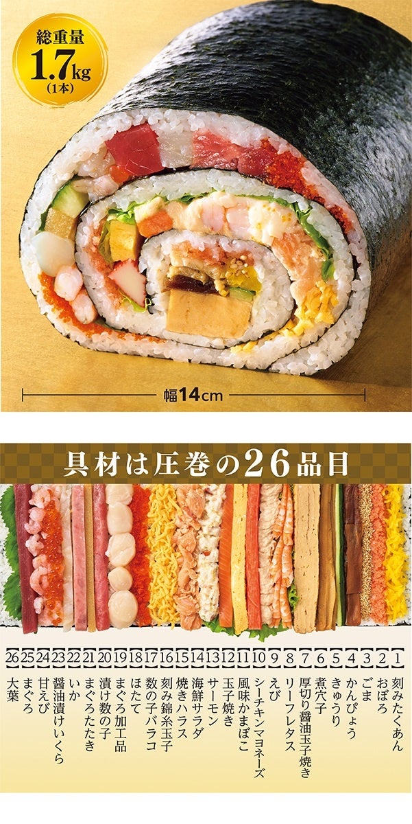 2026年にちなみ26種類の具材を巻いたイオン史上最大、最重量の恵方巻です。長さ18cm×幅14cm、総重量1.7kg(1本)の圧巻なサイズに、海鮮を中心に彩り豊かな具材を豪快に巻き上げています。家族や仲間とシェアして、節分の食卓を華やかに彩る一本です。