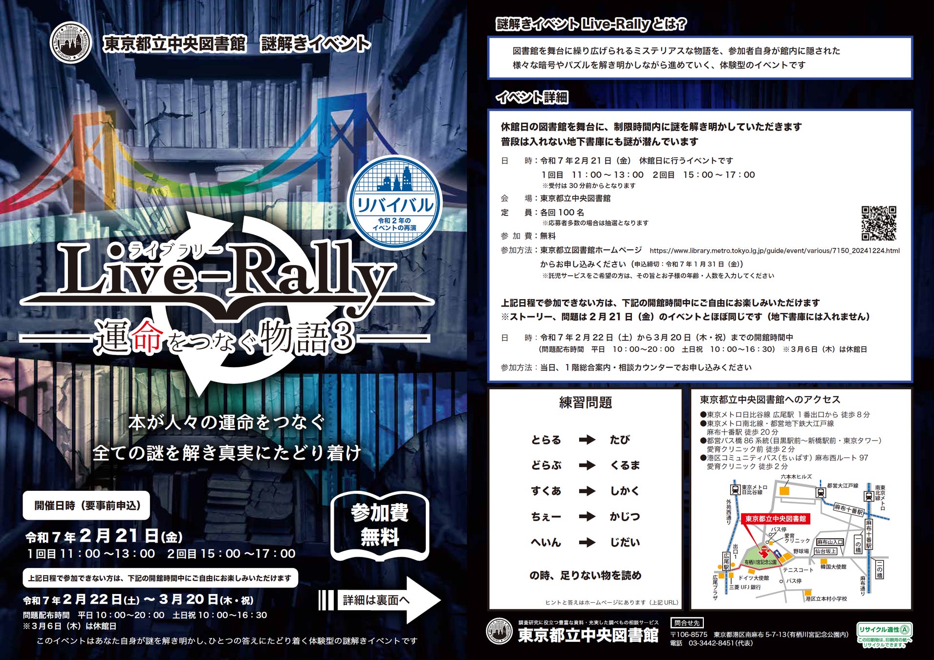 東京都立中央図書館 謎解きイベント「Live-Rally(ライブラリー)―運命をつなぐ物語3―」の開催