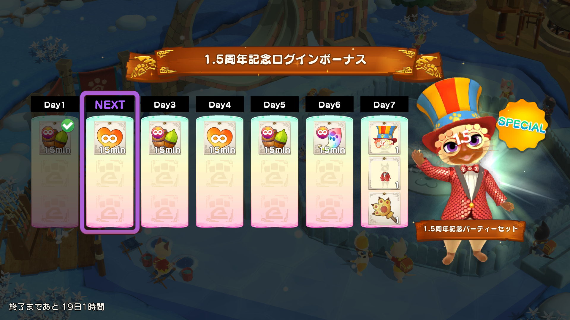 ※「1.5周年記念パーティーセット」を入手するには7日間ログインする必要があります。