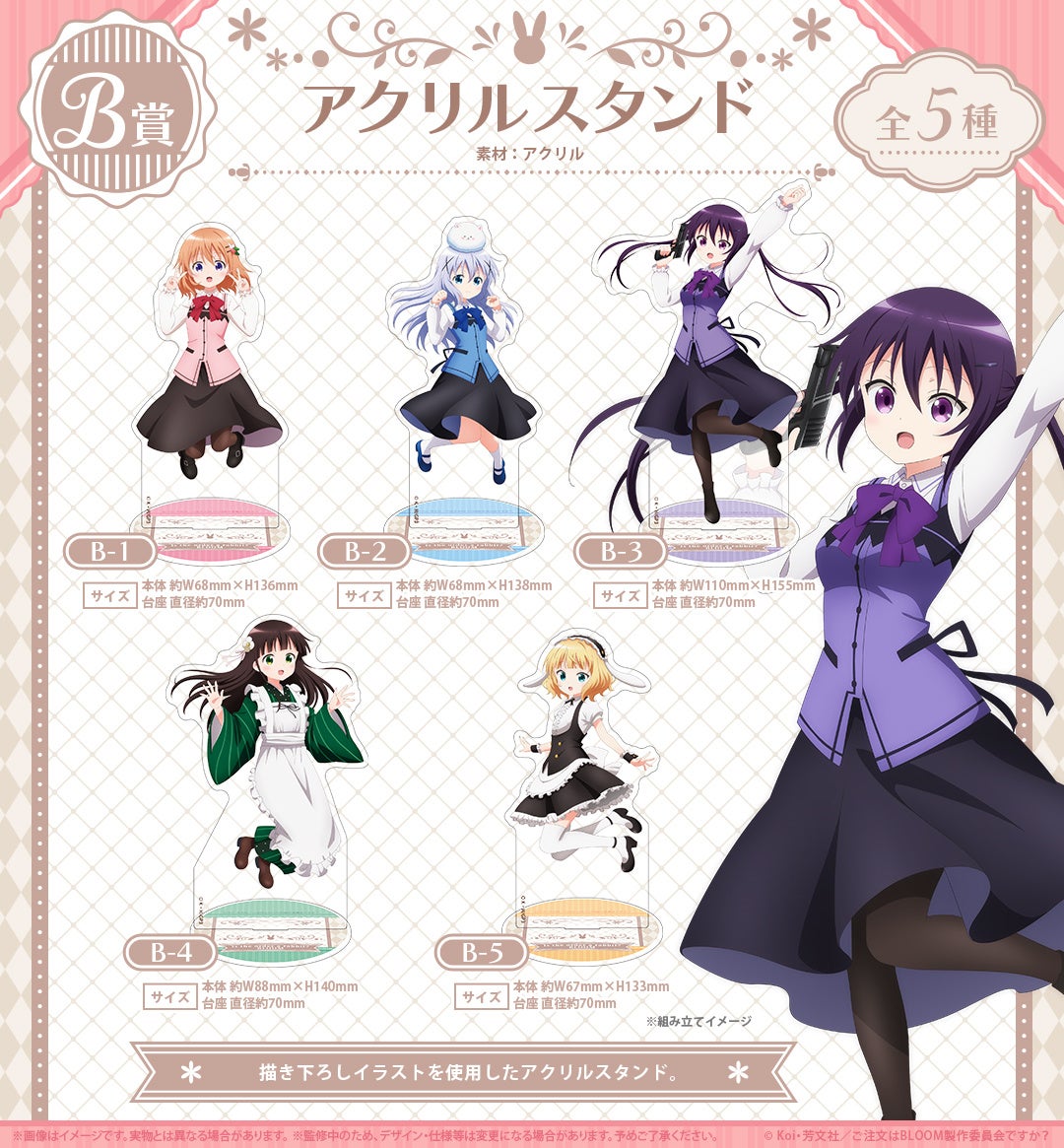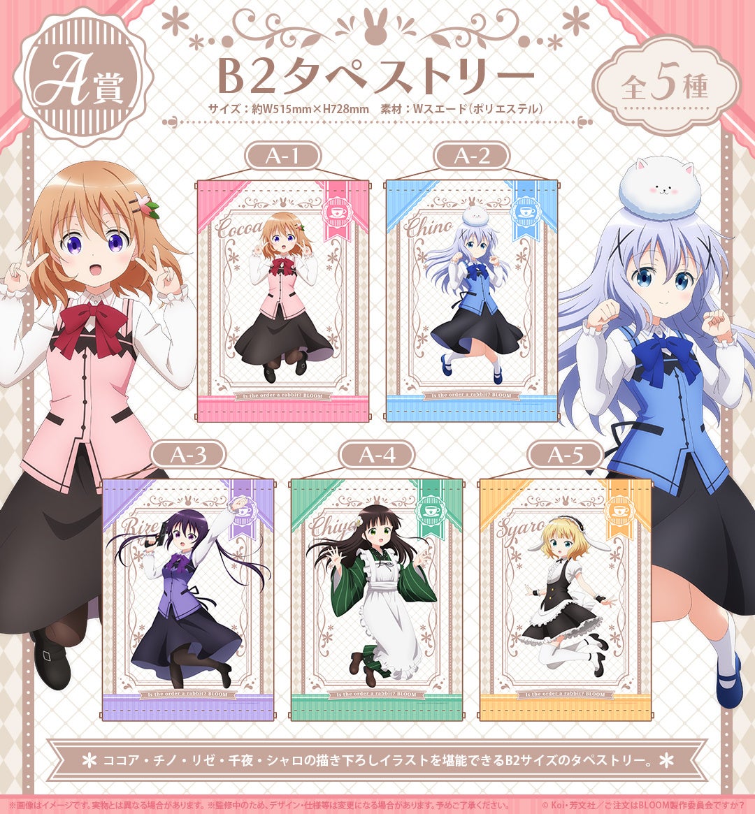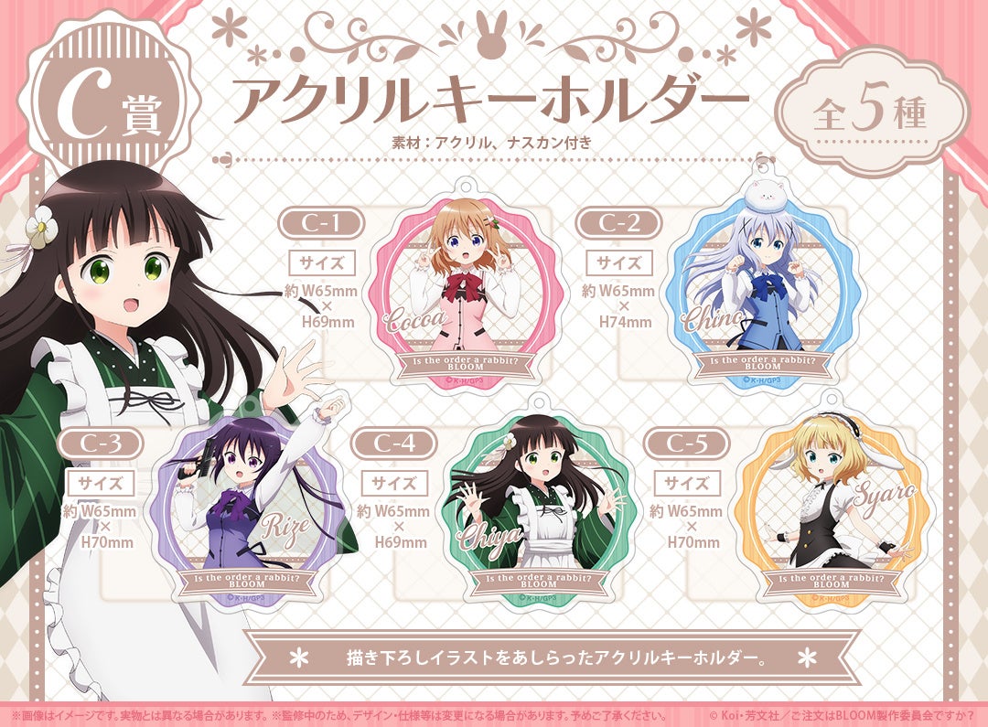 描き下ろしイラストを使用したココア・チノ・リゼ・千夜・シャロのグッズが当たる!『ご注文はうさぎですか? BLOOM』オンラインくじ