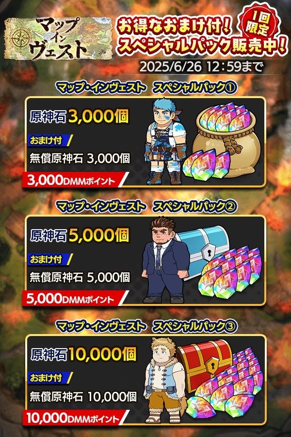 「マップ・インヴェスト」開催、「ガイ IF」の登場を記念して原神石に加え、育成素材が入手できてお得な「マップ・インヴェスト「ガイ IF」育成促進パック」と、スペシャルパックも3種登場!こちらも是非お見逃しなく!