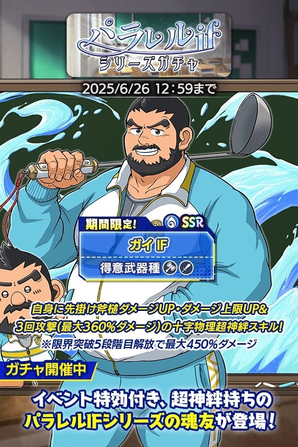 今回は新たな装いのガイ、「ガイ IF」が登場します。イベント特効、超神絆スキル持ちの強力な能力に加え、新たな世界観での個別シナリオに大注目です!