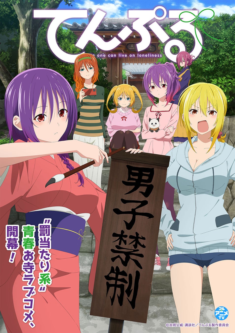 『てんぷる』の主人公は、女たらしの家系として知られる赤神家を疎んじて、勉強とバイトに明け暮れる日々を過ごしていた赤神明光。ある日偶然出会った少女、蒼葉結月に一目惚れしてしまった明光は、自らの血に抗い、ストイックに生きるため寺へ入るが、そこは美少女だらけの尼寺だった…!? キュートな三姉妹&W居候美女との青春お寺ラブコメを、ぜひお見逃しなく!