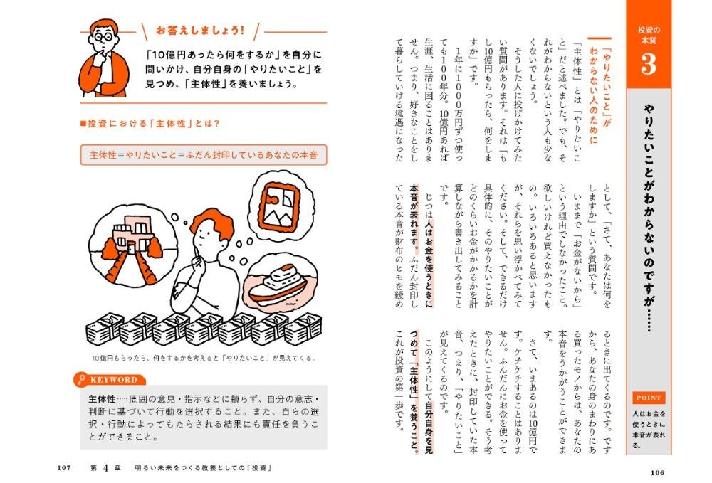 本書では、そんな「投資」についての考え方はもちろん、そもそもお金がどんな力を持つのか、どんな使い方があるのか、働いてお金を得るとはどういうことか、起業や転職など新時代の働き方などについてもじっくり考えていきます。