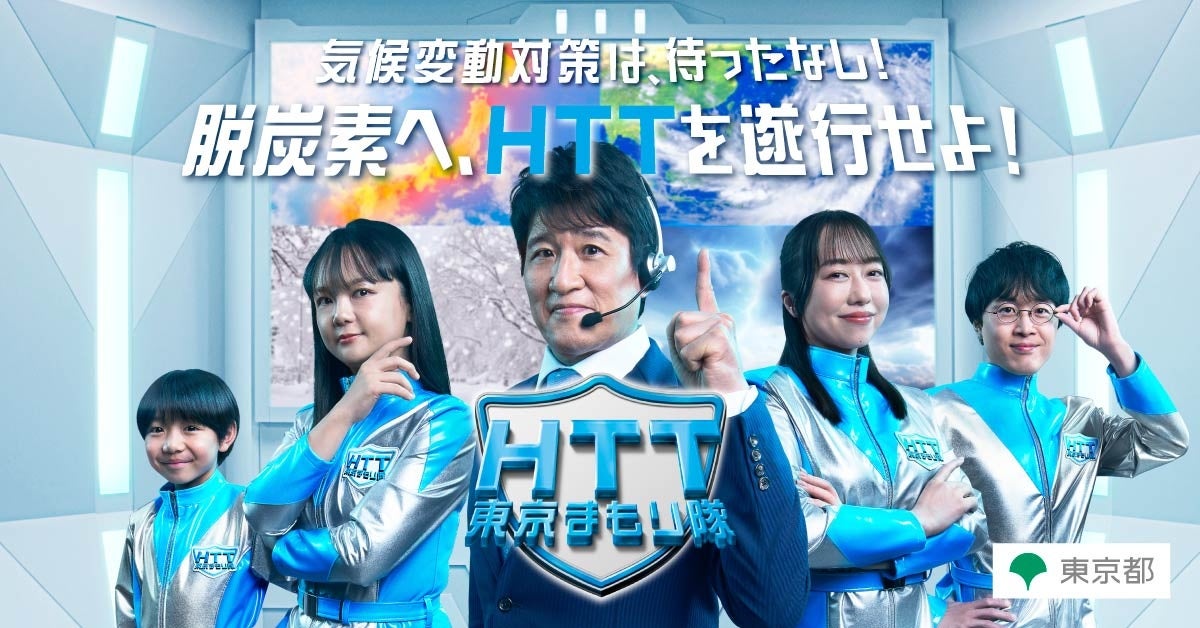 東京都では、気候危機への対応として電力を「Ⓗへらす・Ⓣつくる・Ⓣためる」=「HTT」をキーワードに、脱炭素化に向けた取組を進めています。本CMでは、「HTT東京まもり隊」という設定のもと、異常気象の要因の一つであるCO₂の削減に向けたアクションを紹介しています。