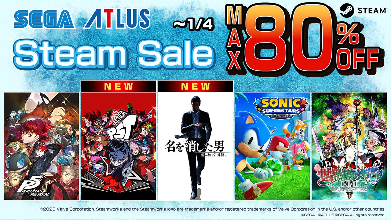 今回のセールでは、『龍が如く7外伝 名を消した男』とアトラスの『ペルソナ5 タクティカ』が25%割引にてSteam版セールに初登場。他にも、『ソニックスーパースターズ』や、『初音ミク Project DIVA MEGA39’s+』、『ペルソナ5 ザ・ロイヤル』といった人気タイトルを特別価格で販売しております。