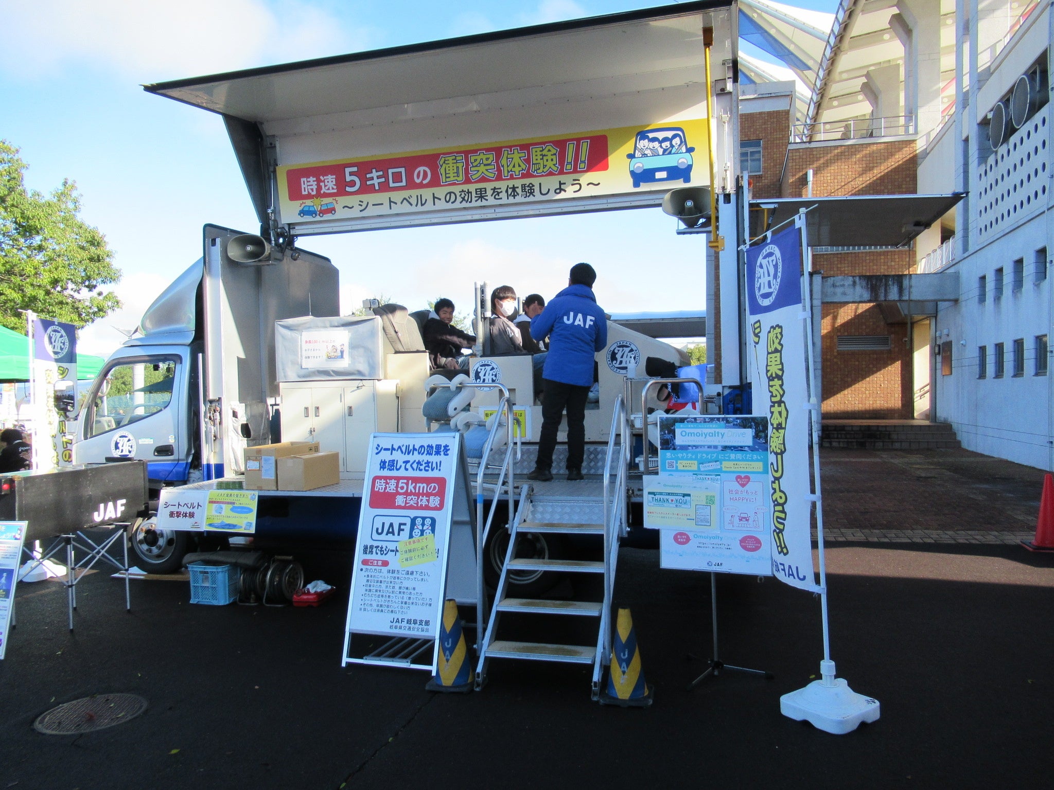 JAFブースでは、子供向けに電動キッズカートなどを用いたモータースポーツ体験コーナーや交通安全コーナーとしてシートベルト効果体験などで来場者に向けた交通安全意識を喚起します。