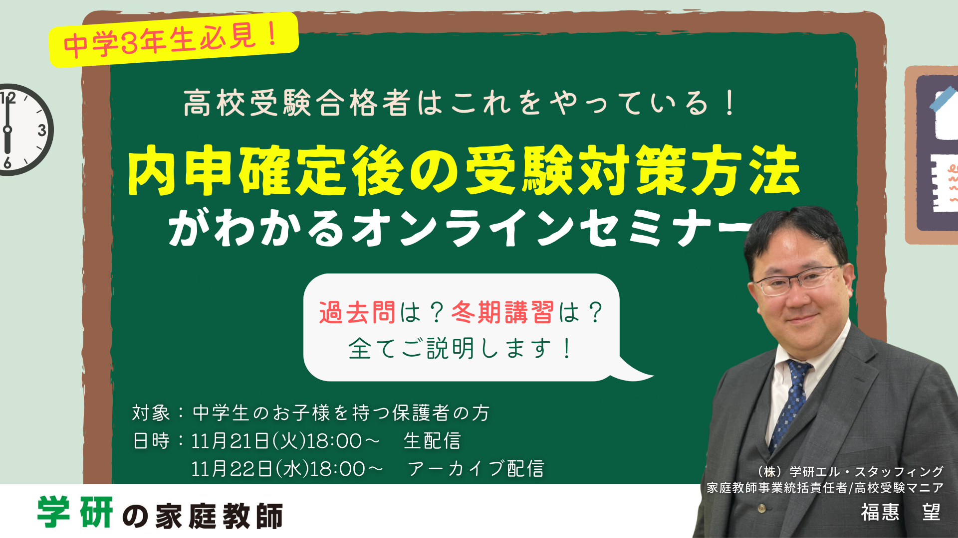 学研の家庭教師が、「高校受験合格者はこれをやっている!内申確定後の受験対策方法がわかるオンラインセミナー」を11月21日(火)、11月22日(水)に開催します!