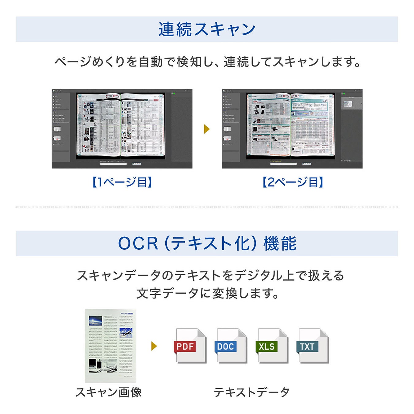 液晶モニターを搭載しているため、スキャンからデータ保存までパソコン不要で操作可能です。すぐにデータ化して共有できるため、効率的な業務をサポートします。もちろんパソコンに繋いでも使えます。専用ソフトをインストールすることで多彩な機能でスキャンできます。撮影した本の曲面を補正したり、写り込んだ指を削除したり、文書のOCR機能などは専用ソフトで使えます。