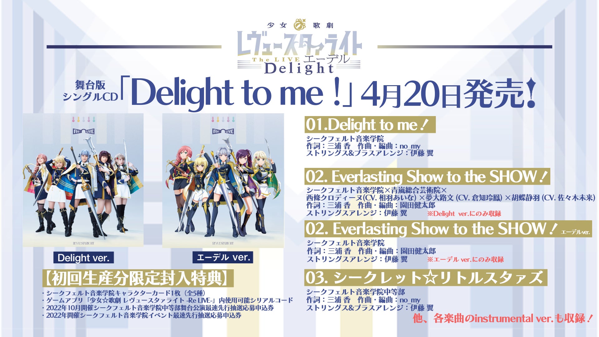 少女☆歌劇 レヴュースタァライト -Re LIVE- 舞台主題歌シングル シークフェルト音楽学院「Delight to me!」本日発売!