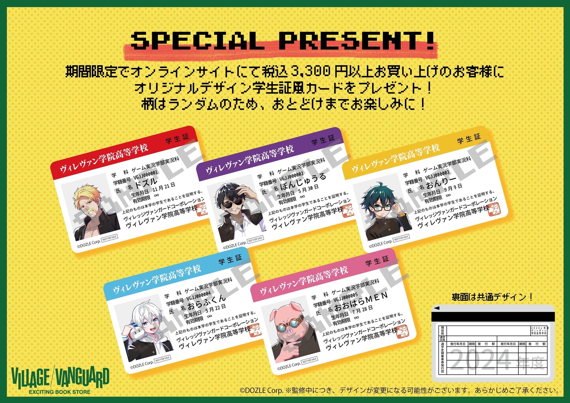 販売期間中に、ヴィレッジヴァンガードオンラインストアにて【ドズル社第二弾コラボグッズ】を税込〈3,300円〉以上ご購入いただいたお客様全員に、【オリジナルデザイン学生証風カード】をランダムで1枚プレゼントいたします。