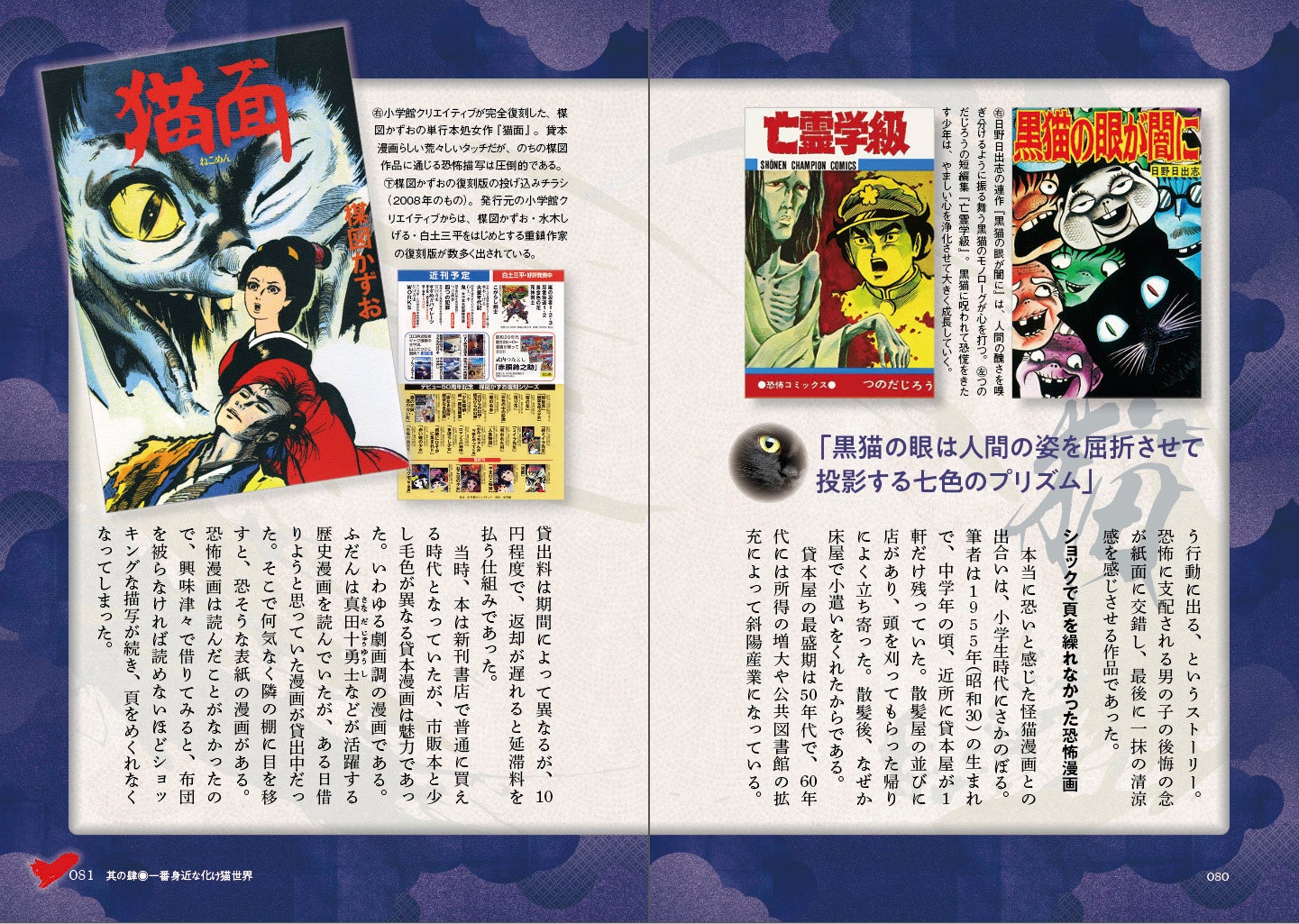 「黒猫の眼が闇に」日野日出志/「亡霊学級」所収「猫」つのだじろう/「猫目小僧」楳津かずお/「猫面」楳図かずお/「へび少女」楳図かずお/「黒い猫面」楳図かずお/「狐がくれた木の葉っぱ」所収「猫面」楳図かずお/「楳図かずお 恐い本11」/「水木しげる猫漫画短編集15選 妖猫夜話」水木しげる/「猫楠」水木しげる/「ねこ娘大全」水木プロ/「妖怪獣 ゲゲゲの鬼太郎 四」水木しげる/「小学館入門百科シリーズ88 妖怪100物語」水木しげる/「ねこようかい」ぱんだにあ/「タタリ」彌/「化け猫さんは恩返しがしたい」梨尾/「化け猫あんずちゃん」いましろたかし など
