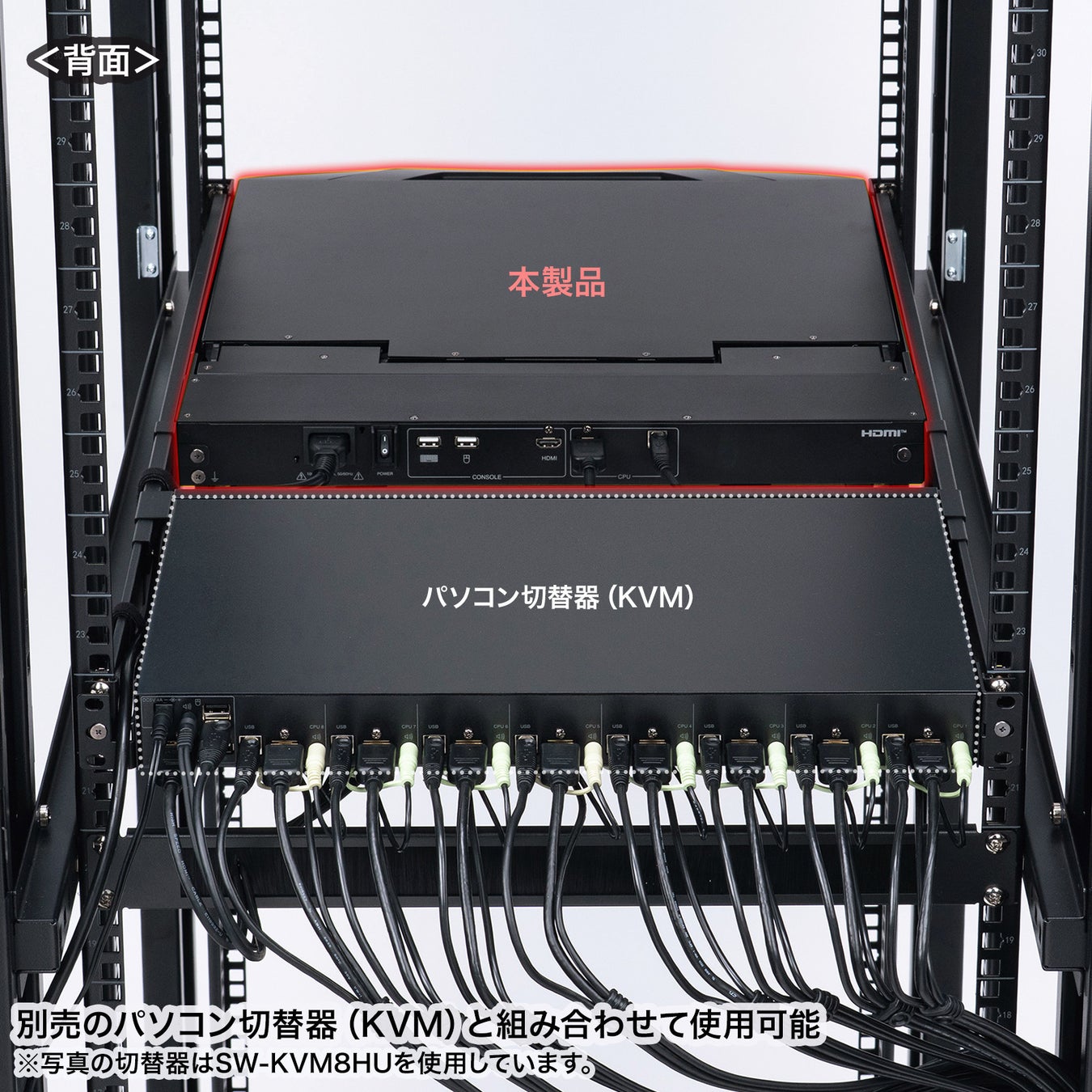 ロングレールに対応し、サンワサプライ製パソコン自動切替器(SW-KVM8HU)(別売)と組み合わせが可能で、複数台のサーバーを切り替えて効率的に操作できます。