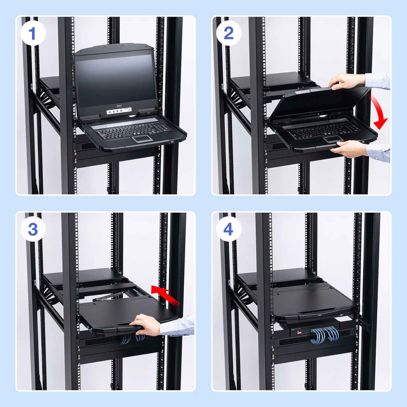サーバー管理に必要なモニター、キーボード、マウスのコンソール類を省スペースに設置・収納できるため、作業効率が格段にアップします。