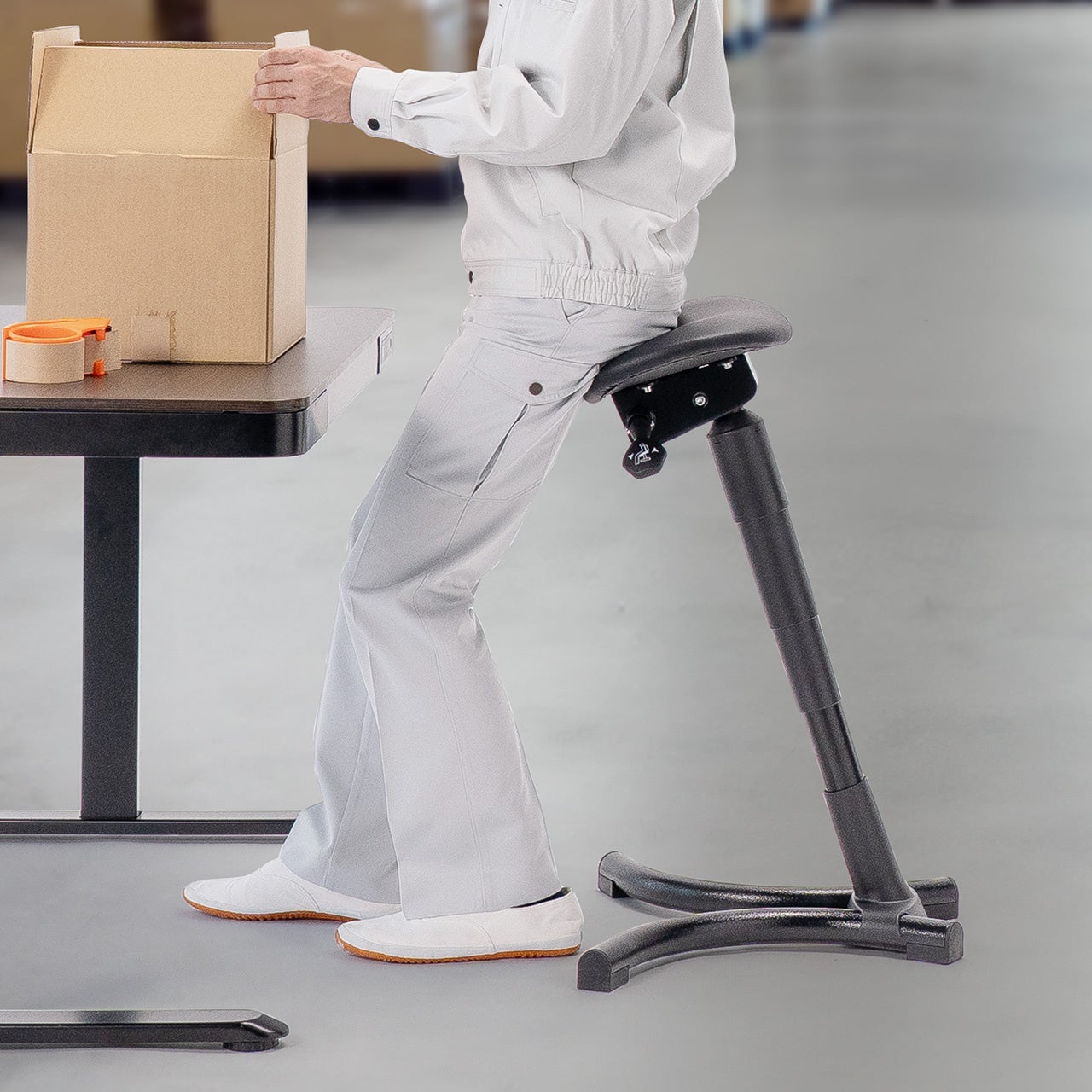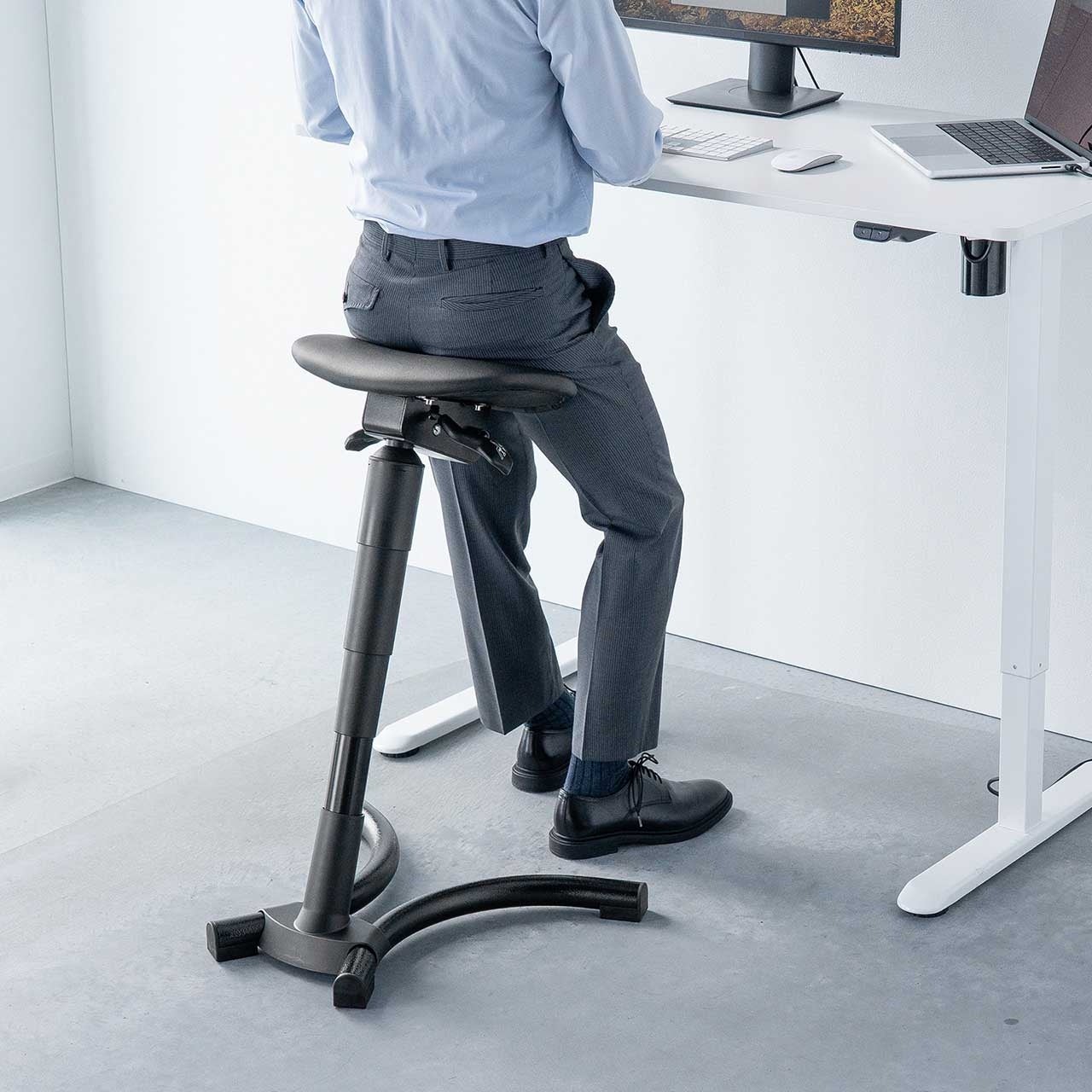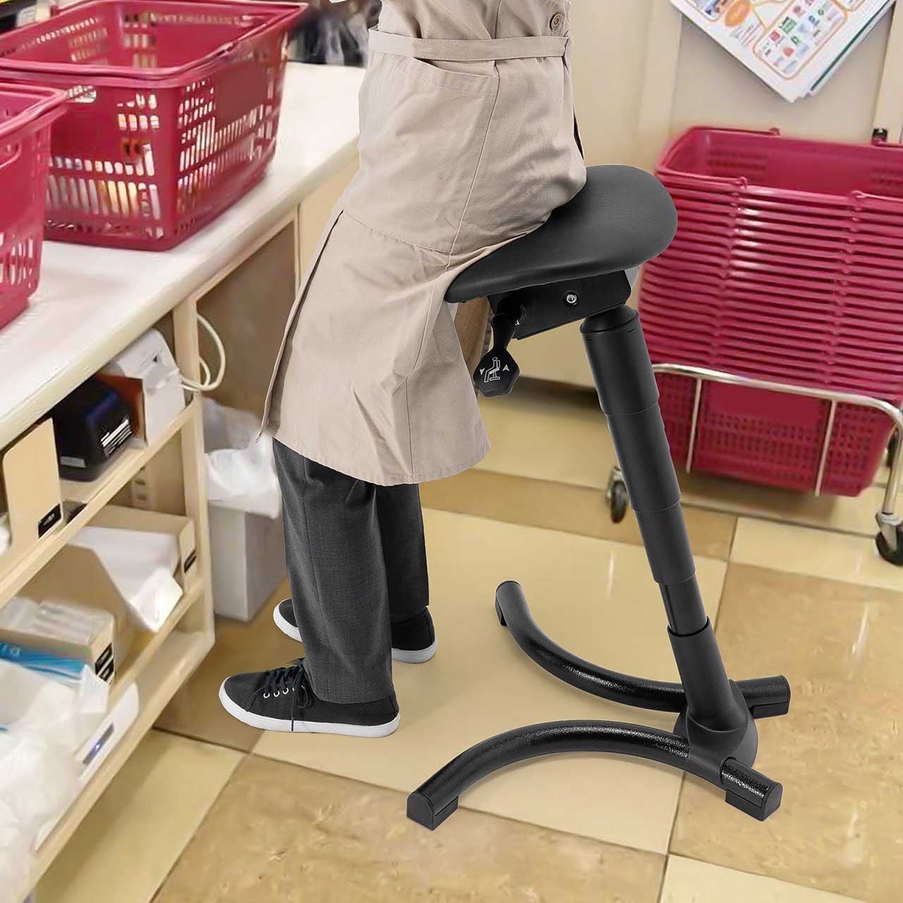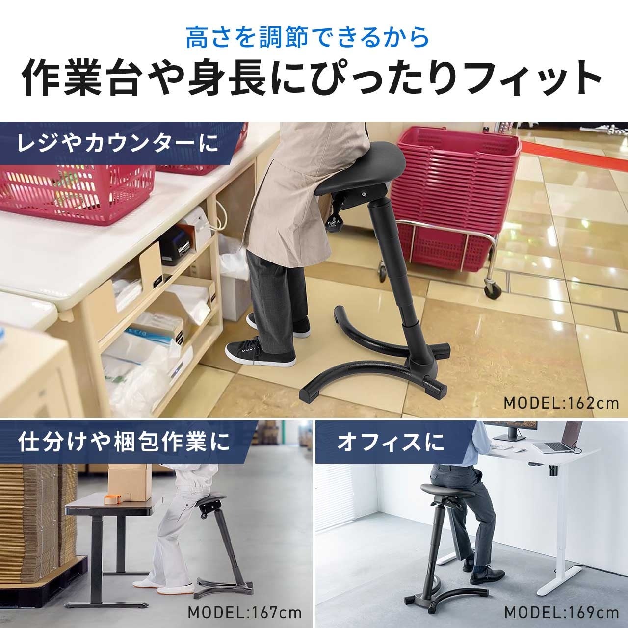 【様々な場所で使用可能】オフィスの昇降デスク用のチェアとして、仕分けや梱包作業、レジ作業にも最適です。
