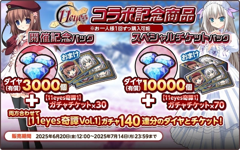 2025年6月20日(金)12:00より、コラボを記念した【開催記念パック】と【スペシャルチケットパック】の販売を開始致しました。限定コラボPickUPガチャ【11eyes奇譚~『赤い夜』の果てに~ Vol.1】をオトクに回せるパックです!