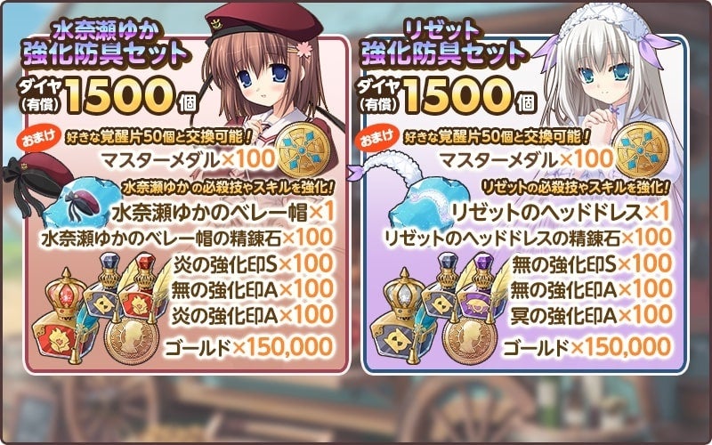 2025年6月20日(金)12:00より、【水奈瀬ゆか強化防具セット】と【リゼット強化防具セット】の販売を開始致しました。限定コラボPickUPガチャ【11eyes奇譚~『赤い夜』の果てに~ Vol.1】で獲得した新キャラを育てるのにオトクなパックです!