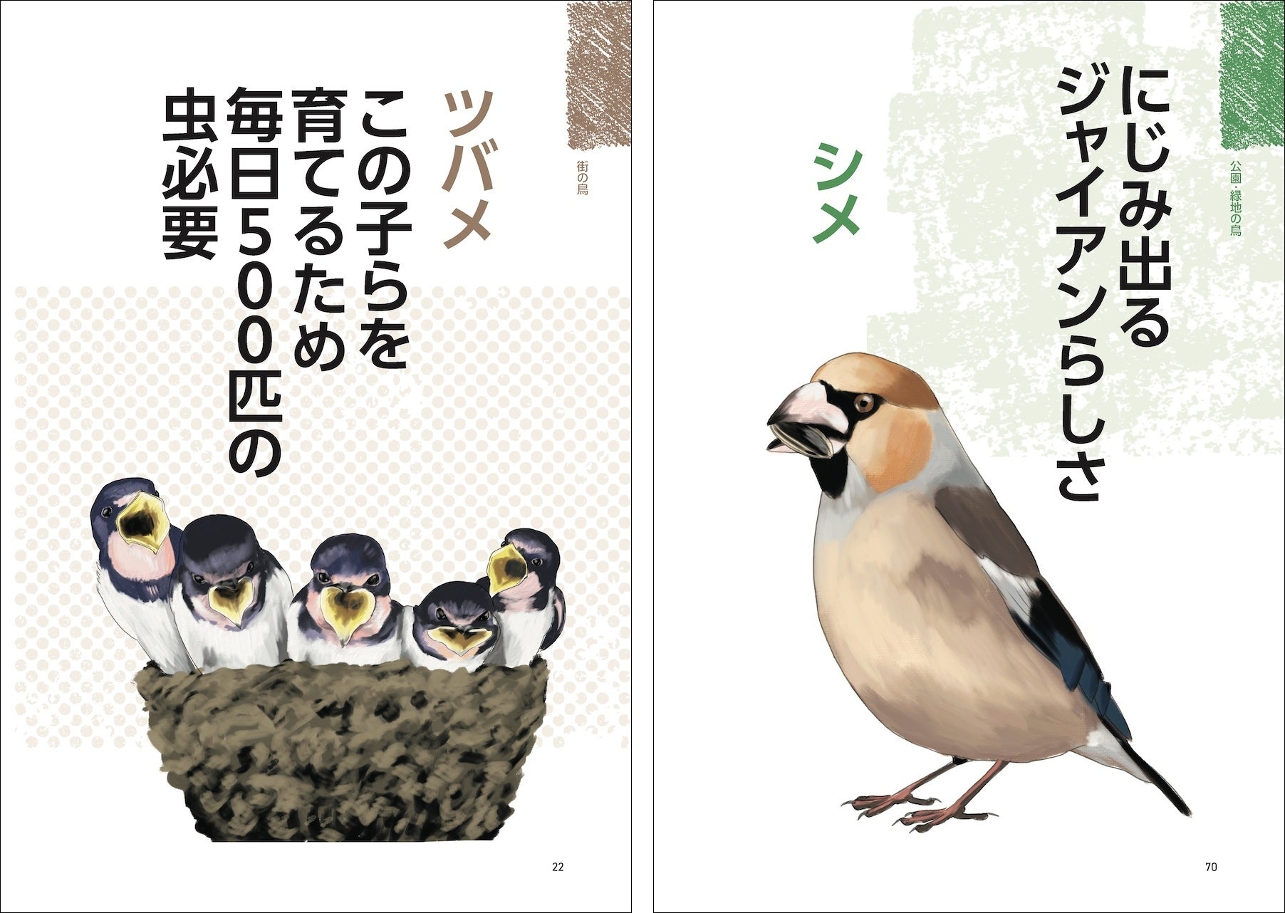 「街の鳥」「公園・緑地の鳥」「野山の鳥」「水辺の鳥」と見かけやすい環境ごとに、80種類ほどの鳥を紹介しています。