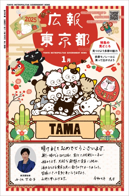 1月号の表紙は新年ということもあり、お正月モチーフをあしらった表紙にしました。特集のテーマである「多摩」にちなんだ3匹の猫のキャラクターが勢揃いし、楽しさと賑やかさを演出してくれています。