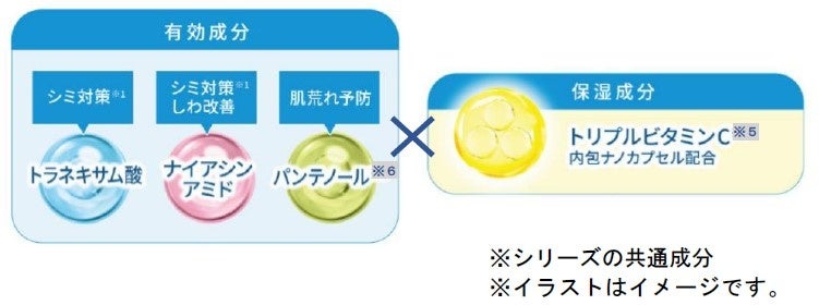 薬用美白※1)成分である、シミ・そばかすを防ぐ※1)トラネキサム酸、シミ対策※1)・しわ改善のナイアシンアミド、肌荒れ予防成分のパンテノール※6)を配合しています。また、お肌にうるおいを与える保湿成分トリプルビタミンC※5)をナノカプセル化して配合することにより、