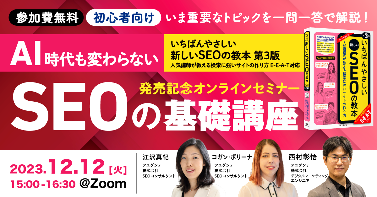 本書の発売記念に、いま重要なSEOのトピックを一問一答形式で解説する「AI時代も変わらないSEOの基礎講座」を12月12日(火)の15時から実施します。本書の著者陣が「SEOとはなにか」「Googleの最重要コンセプトであるE-E-A-T」「これからのSEO対策」について解説します。参加費は無料で、どなたでも視聴いただけます。下記の特設ページよりお申し込みください。