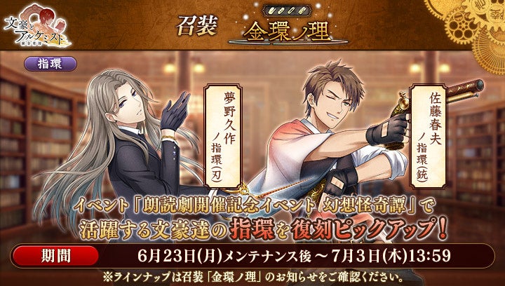 召装『金環ノ理』のラインナップを更新いたしました。この召装では、イベント『朗読劇開催記念イベント「幻想怪奇譚」』で活躍する「佐藤春夫」「夢野久作」の指環を一定の確率で入手できます。